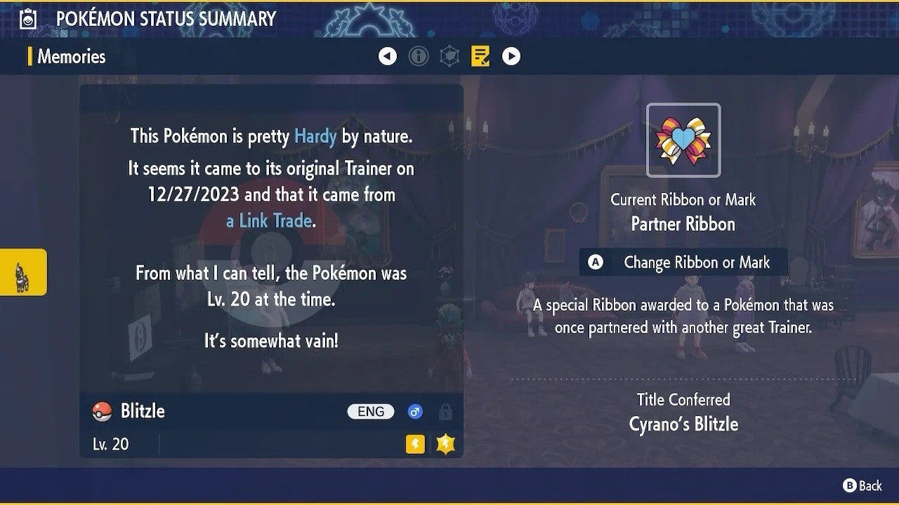 Blitzle Shiny Cyrano Gift DLC Indigo Event Untouched IV Pokémon Scarlet Violet