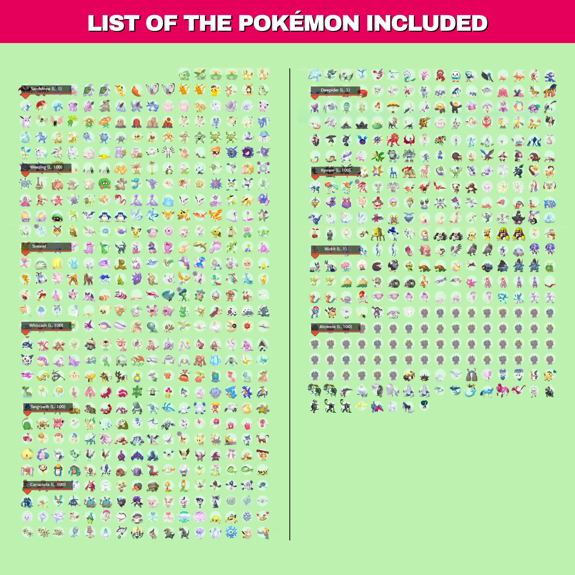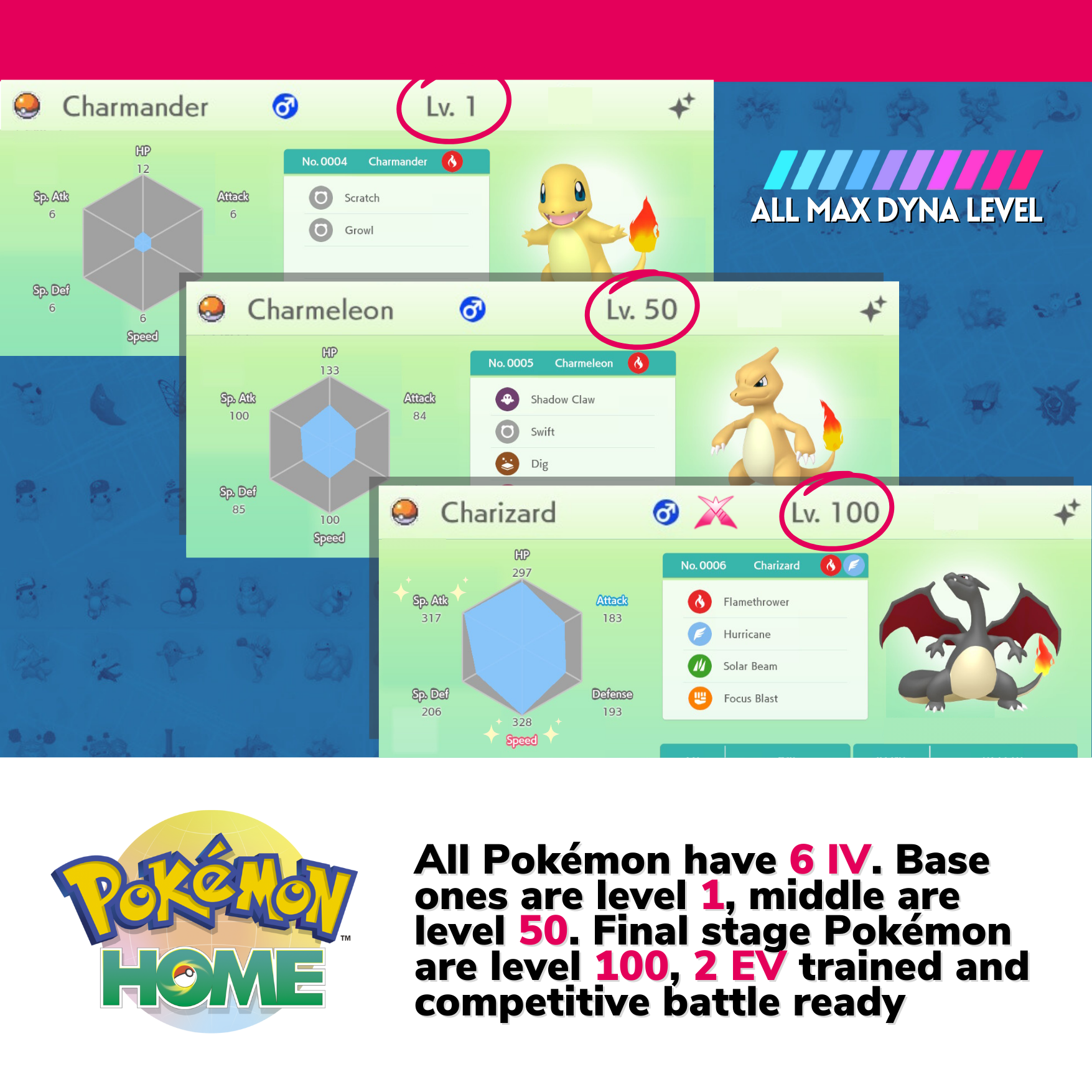 ★ All Pokémon are 6 IV. The level 100 ones got 2 EV hyper trained and competitive moveset. They have Custom level sets as explained in the images. Those that don't evolve (as Zacian) are level 100 by default.
