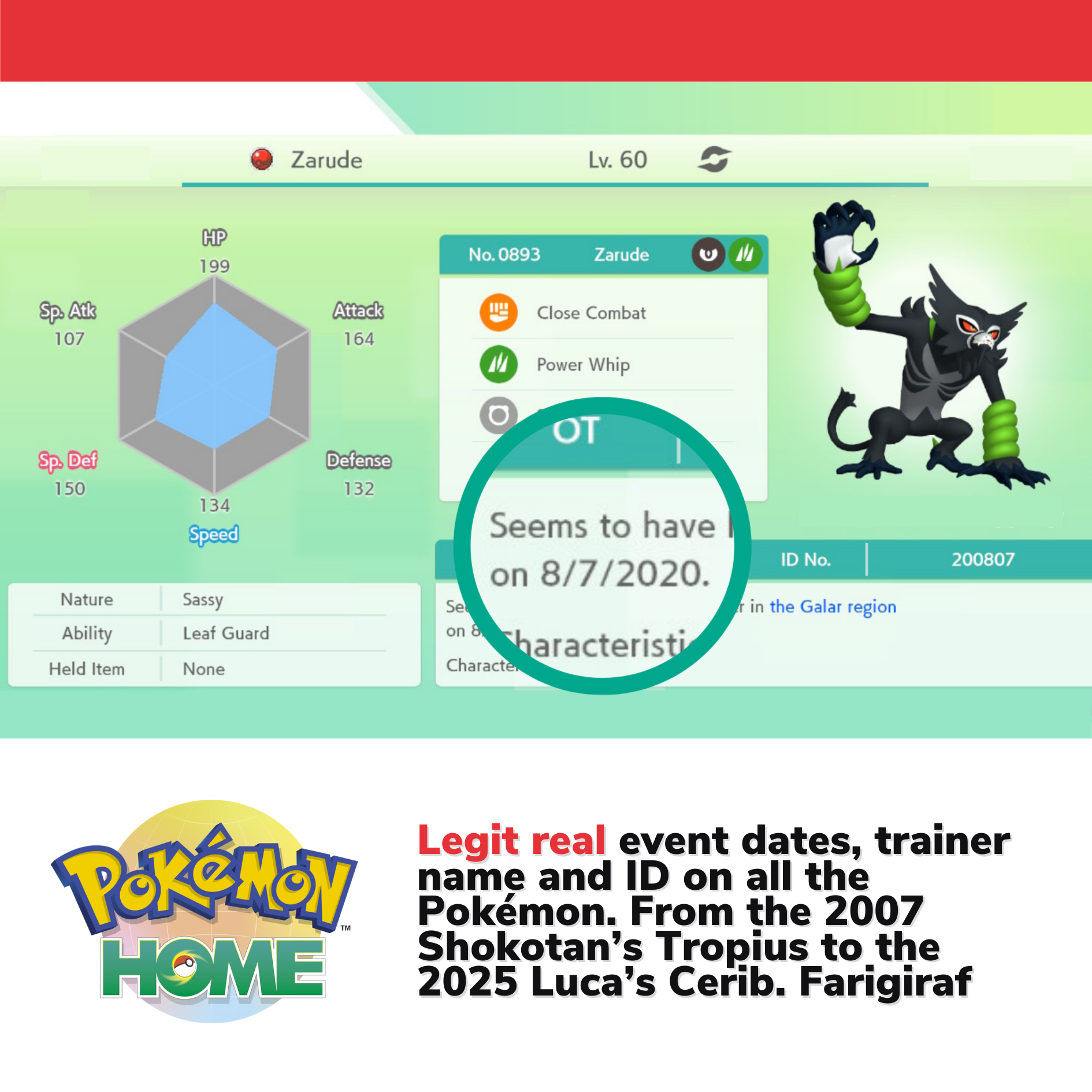 We are proud to present you the first Cherish Dex in the world. It includes exclusively Pokémon distributed inside Cherish Balls, during limited-time events, from 2007 until today. And all their evolutions. If a Pokémon was distributed in more than one event, we chose the one that was most significant for us, giving priority to American events. This is to avoid providing you with a Cherish Dex with dozens and dozens of duplicates, which would have ended up needlessly clogging up your Pokémon Home. The Pokémon included in this collection have the original statistics of the event, as well as the moves and the date on which they were distributed. At present there is no similar package in any other store. We are the only ones in the world to sell it. All the Pokémon included can be used online, and transferred to all compatible games for Nintendo Switch. Even those that will be released in the future. If a Pokémon was distributed in a Cherish Ball in both a Shiny and Non-Shiny version, you will get both. At the end of this description you will find a detailed list with all the events we have included.
