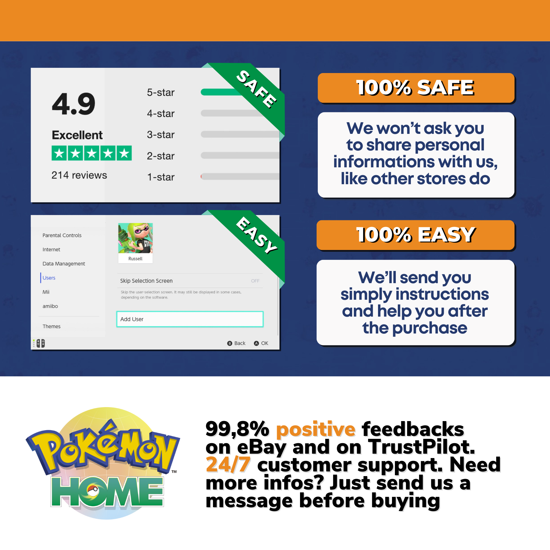 Purchase the Living Dex and then decide if send us your Nintendo username and password or procede to the login by yourself. We’ll transfer the entire Living Dex into your Home in few minutes. You can change your password after the transfer is complete, or set a temporary password before the transfer. Anyway, we won't ask you to turn off the 2-steps verification as other sellers do: you will keep the control of your account during the whole transfer process. Also we won’t keep your personal datas. Don’t take our word for it: check out our positive reviews! The purchase refers to the strategic guide only, the included Living Dex is a free bonus. By purchasing, the customer understands that payment is for the guide itself, while the Living Dex included is a gift from us.